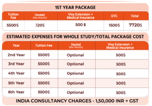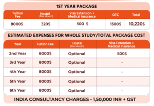 Alte University offers MBBS with an annual tuition fee of approximately USD 5,500. Hostel facilities are optional, with an estimated monthly cost of around USD 320 if opted. The first-year total package cost is approximately USD 7,720, including tuition, visa extension, medical insurance, and other administrative services. Living and food expenses are additional and depend on student lifestyle choices.
