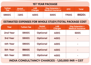 Alte University offers MBBS with an annual tuition fee of approximately USD 5,500. Hostel facilities are optional, with an estimated monthly cost of around USD 320 if opted. The first-year total package cost is approximately USD 7,720, including tuition, visa extension, medical insurance, and other administrative services. Living and food expenses are additional and depend on student lifestyle choices.